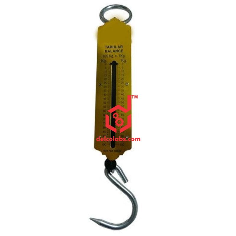 Flat form, painted metal case with easily readable brass scale with graduations engraved on both sides of the index pointer. Provision for zero adjustment at the top. With suspension ring and load hook. With flat scale at the front attached to rectangular cast metal body at the rear. Heavy design provides long life to the balance.