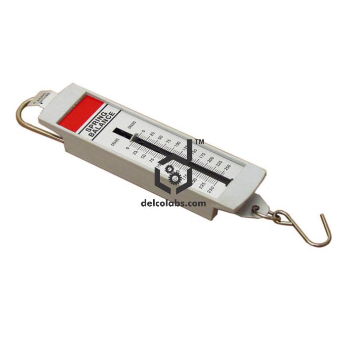Rectangular plastic body, metal scale, with zero adjuster, suspension ring and load hook. Scale only in grams.