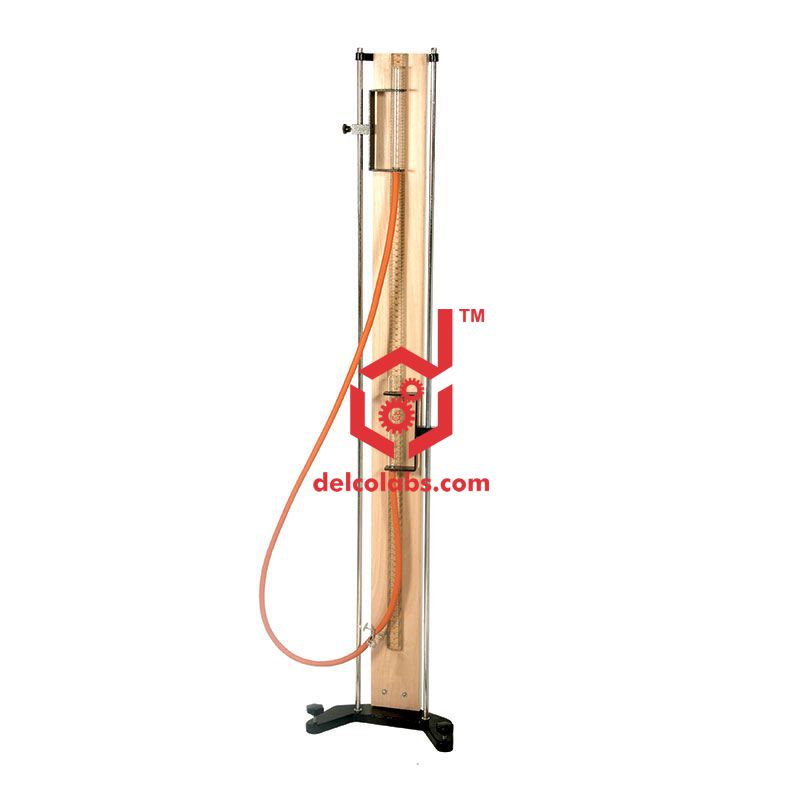 Demonstrates the relationship between pressure and volume of a given mass of gas at a fixed temperature, i.e., Boyle's Law. Consists of two glass tubes – one having both ends open and the other having one end closed. Both the tubes are mounted on vertical support rods with the help of sliding brackets that can be positioned anywhere along the length of the rod and are connected to each other through a flexible pressure rubber tubing. A meter rule graduated 0-100cm × 1mm, reading in both directions present between the two support-rods on a wooden back plate and facilitates level reading in both the tubes. Complete apparatus mounted on a stable cast-metal base with levelling screws. Requires mercury for use, not included (available optionally).