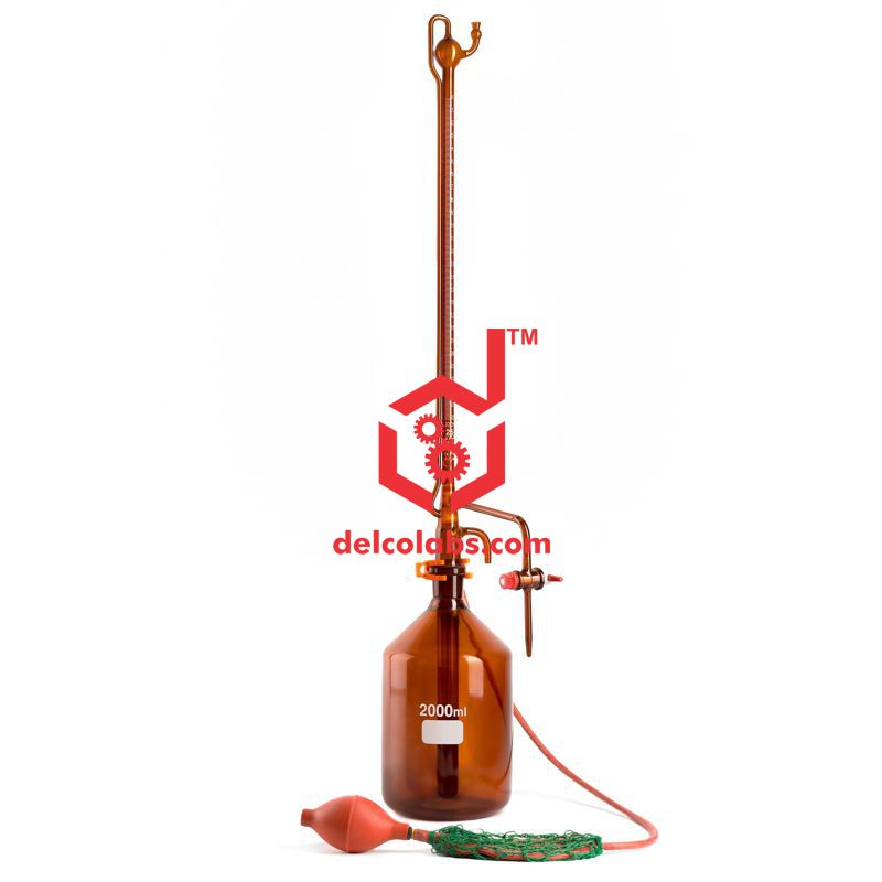 Made of Borosilicate Glass. Conforms to DIN ISO 385,  mounted on reservoir with rubber bellow.