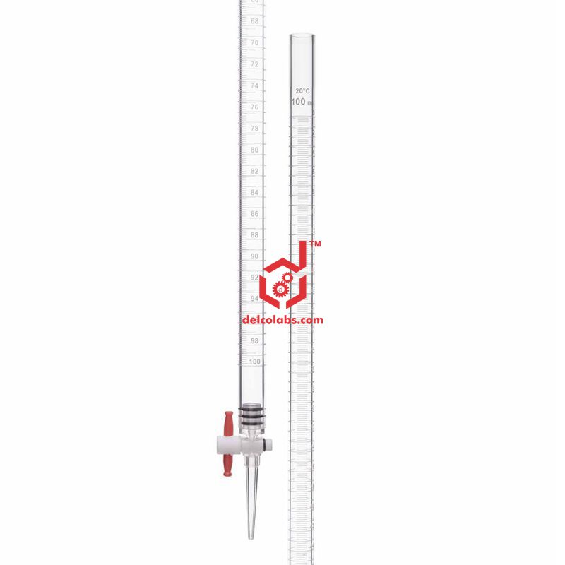 Acrylic Burettes with 100ml capacity are durable, lightweight, and resist shattering, impact, and most non-abrasive cleaners including ammonia and strong detergents. Comes fitted with a polytetrafluoroethylene (PTFE) plastic plunger key stopcock affording low friction use while resisting chemicals, moisture, and high temperatures. Calibrated for delivery. Note: Not for use with hydrofluoric acid or ammonium hydroxide. Not autoclavable.