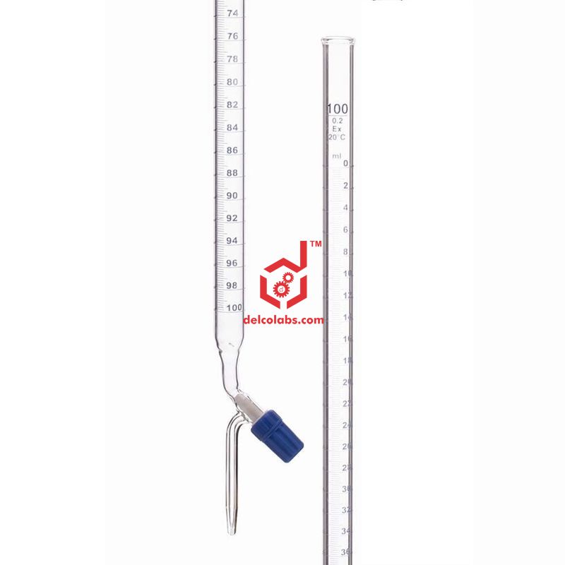 Single straight bore burette made from heavy duty, borosilicate 3.3 glass,. Features Rotaflow key stopcock and white enamel graduations for clear visiblity through dark liquids. Class B, conforms with DIN ISO 385 and ASTM-E287 standards for accuracy. Calibrated to deliver. Capacity 100ml. Graduations: 0.20ml.