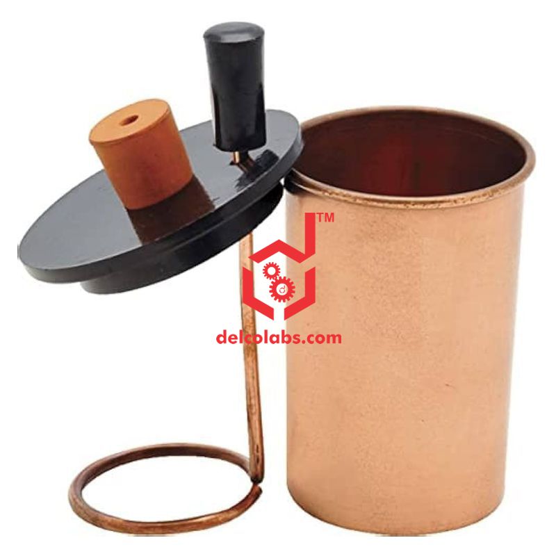 Copper calorimeter with bakelite lid at the top fitted with rubber stopper for thermometer and metal stirrer.