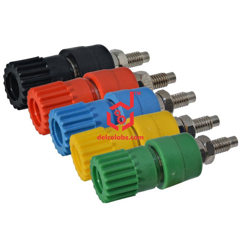 Insulated binding post of thick brass for high amperage applications. Equipped with captive head top along with 2mm transverse hole on central metal part for unterminated leads. Includes nuts and insulating washers.