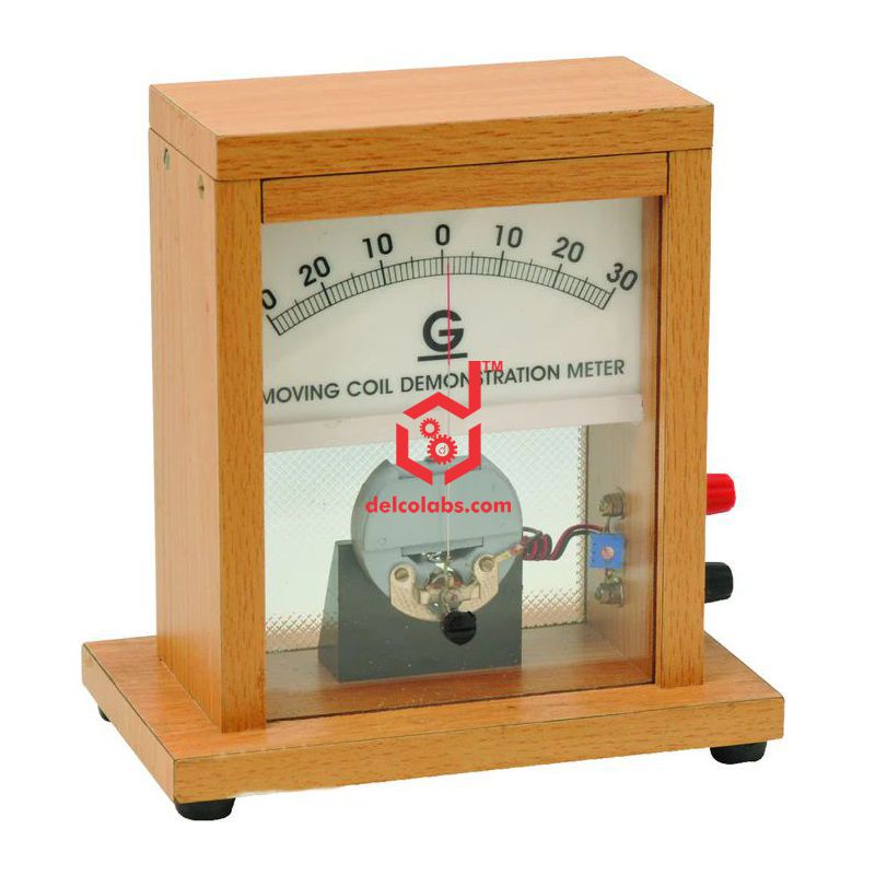 A useful meter for demonstration of the functioning of simple, permanent magnet type moving coil meters to a group of students. Movement with spring control and magnetic damping mounted inside a rectangular wooden frame with clear glass window at the front and ground glass window at the back.