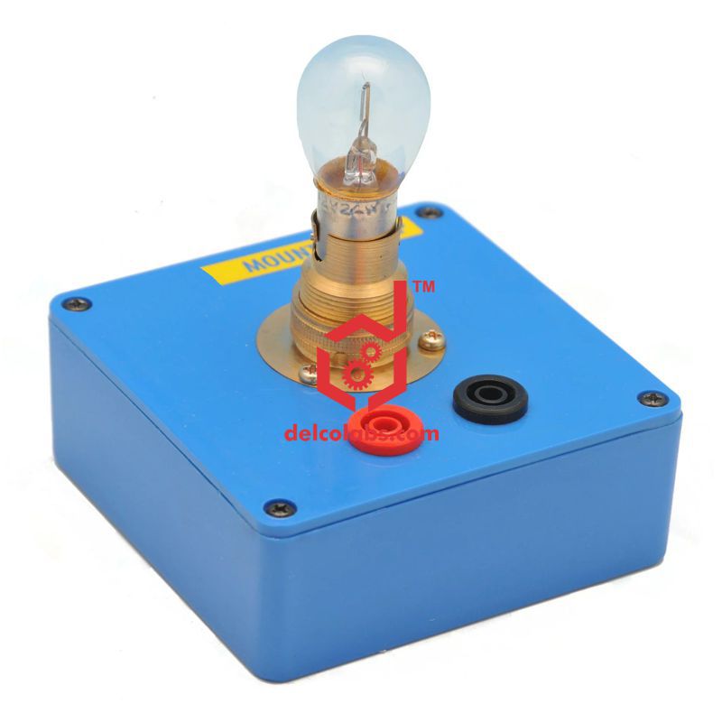 For use with the mounted solar cell and motor. A 12V 24W SBC bulb in a metal socket mounted on a folded metal base 100×63mm with a pair of 4mm sockets. The power rating of the bulb has been chosen so that when it is placed in front of the solar cell, sufficient power is produced to run the motor effectively whilst avoiding the risk of damage to cell by excess light and/or heat.