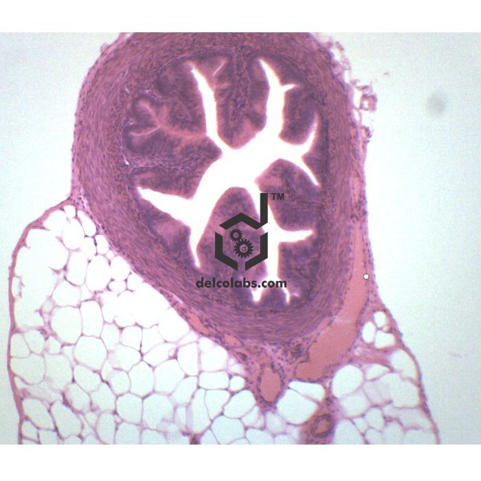 Single, prepared microscope slide with fallopian tube cross section. Shows general structures. Great for biology classrooms to explore structure-function connections as per NGSS standards.   Slide measures 75x25mm approx.