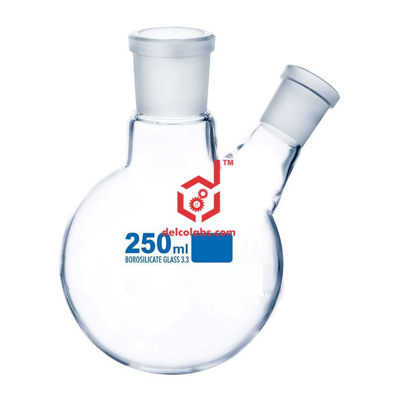 Round bottom boiling flasks having two angular necks, made from borosilicate glass with socket.