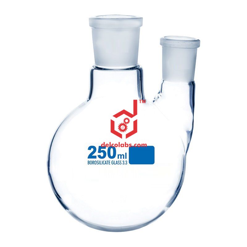 Round bottom boiling flasks having two Parallel necks, made from borosilicate glass with socket.