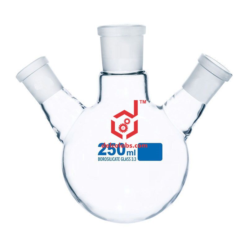 Round bottom boiling flasks having three angular necks, made from borosilicate glass with socket.