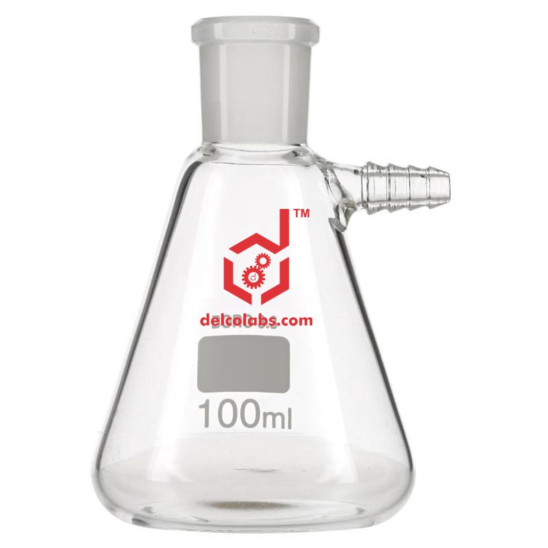 Buchner type flask for vacuum filtration having integral side arm to accept 9mm bore flexible tubing.
