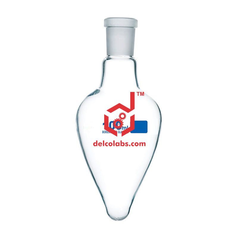 Single neck pear shaped flask made from Borosilicate glass, with ground glass joint.