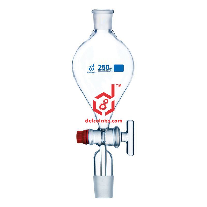 Made of Borosilicate Glass with Glass Stopcock and cone at stem. Pear Shape and supplied with Plastic stopper.  Glass stopper as per specific request from customer.