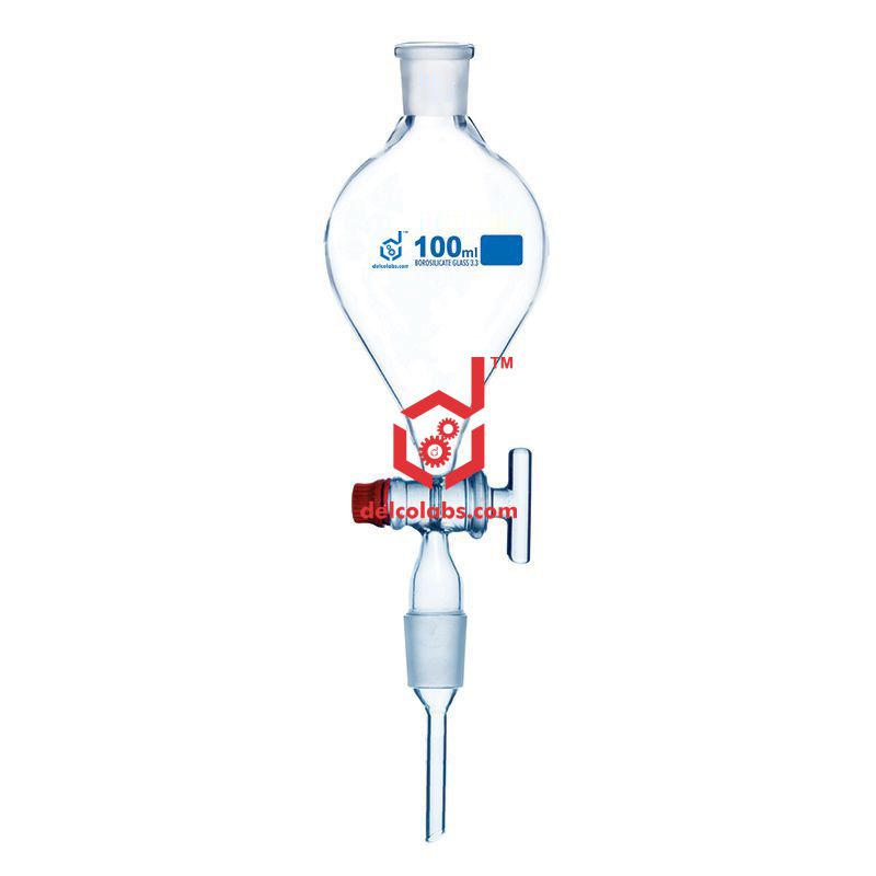 Made of Borosilicate Glass with Glass Stopcock and cone at stem. Pear Shape and supplied with Plastic stopper.  Glass stopper as per specific request from customer.