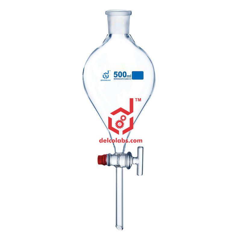 Made of Borosilicate Glass with Glass Stopcock. Pear Shape and supplied with Plastic stopper.  Glass stopper as per specific request from customer.