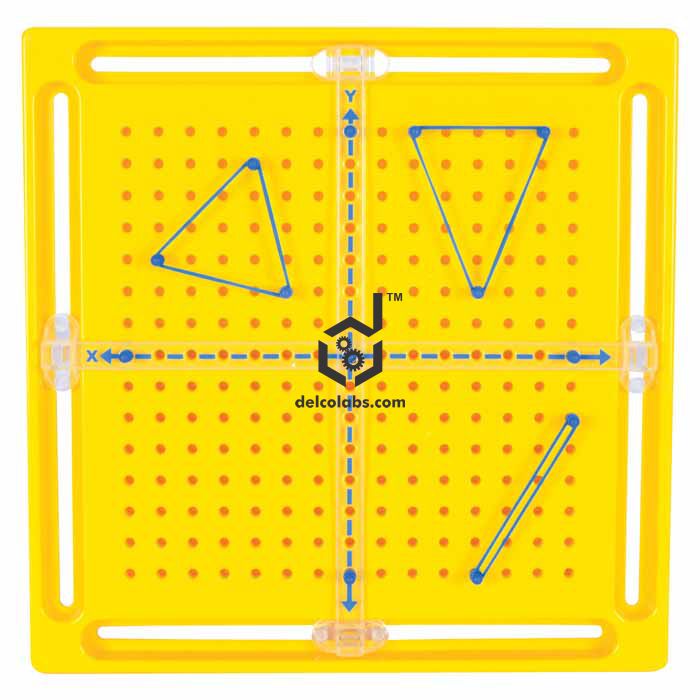 This geoboard has a sliding X and Y axis along with 50 pegs that makes coordinate graphing easy to understand. The pegs can be used to locate points in one or all four quadrants and show various geometric concepts such as equation of a line, slope and a mid-point of a line, translations, rotations, representing data in a bar or line graph, functions with the help of rubber bands.