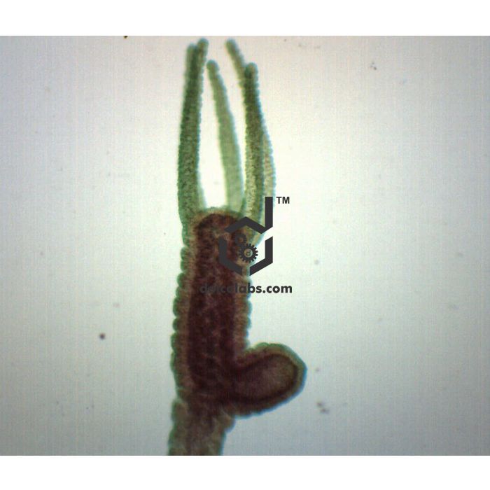 Single, prepared microscope slide with wholemount Hydra Bud. Hydra, a small freshwater organism is known for its regenerative ability. A bud develops in adult hydra to eventually mature into tiny individuals and detach from the parent body. Great for biology classrooms to explore structure-function connections as per NGSS standards.   Slide measures 75x25mm approx.