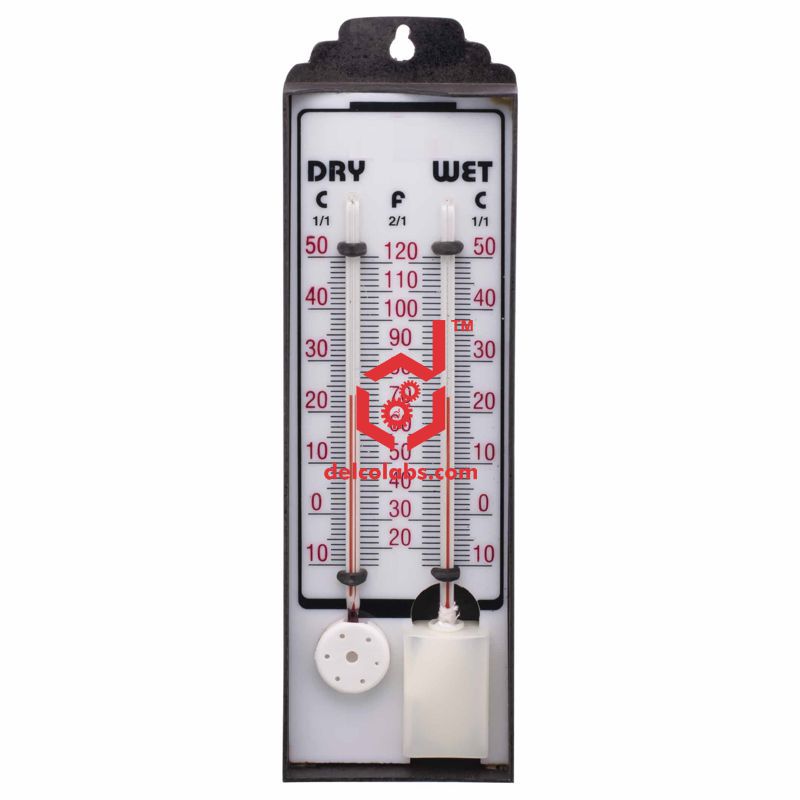 Comprising two thermometers tubes with double scale graduation, mounted on a weather-proof case with shade. Scales graduated -10 to 50 × 1°C and 20 to 120 × 2°F. One thermometer kept dry and other has bulb covered with muslin or wick, dipped into a water reservoir, which keeps it wet during long periods of non-use. Comparing the reading of wet and dry thermometer from the humidity and temperature conversion chart included, relative humidity can be worked out.