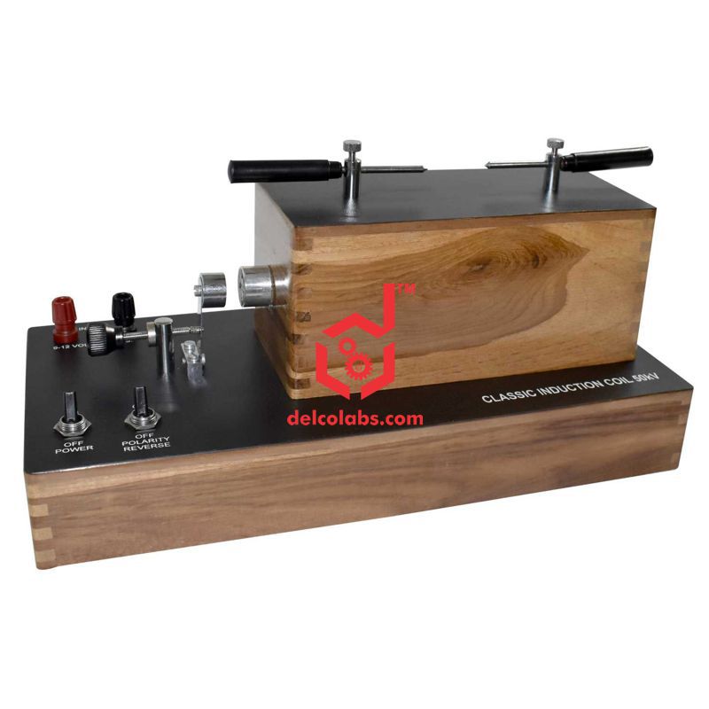 Box form, coils are wound from insulated copper wire and paraffin wax insulation is provided throughout with condenser in polished case, adjustable trembler break with special alloy contacts, with switch allowing primary current to be reversed and removable discharge points. Complete with ON/OFF switch for primary and two terminals lock type for input.