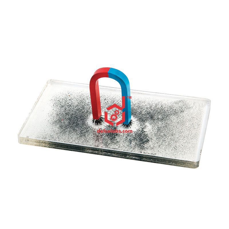 Comprises a rectangular chamber made of clear acrylic which is filled with oil and has high quality, iron filings freely suspended inside. Bringing a magnet in its vicinity makes the filings to align along the magnetic field.