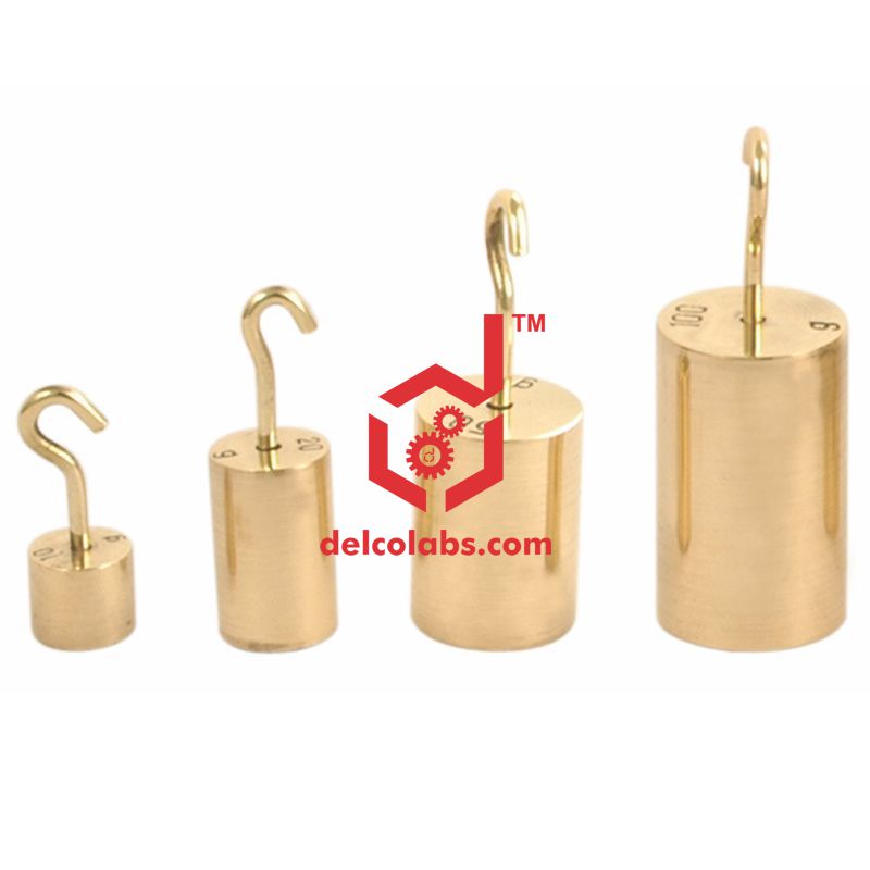 Cylindrical brass masses with a hook at the top for suspension.