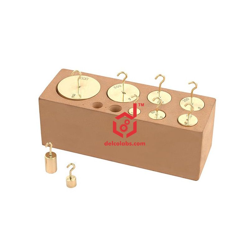 Polished Brass. Masses with hook at one end. Set of 9 masses; 5, 5, 10, 10, 20, 50, 100, 100, and 200g.