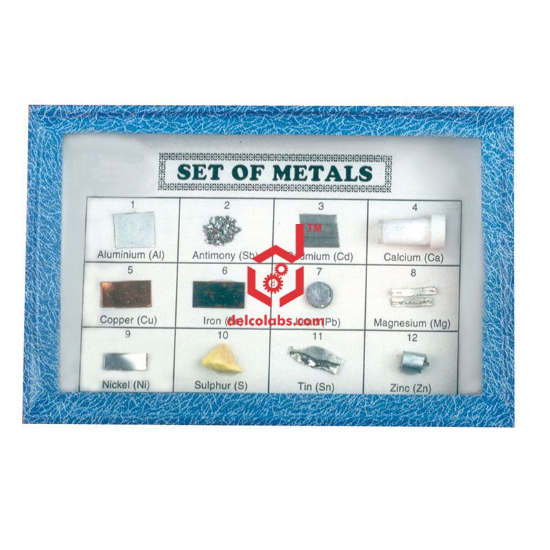 A collection of 12 different types of metals mounted in a tray with glass front. All specimens properly labeled and numbered.