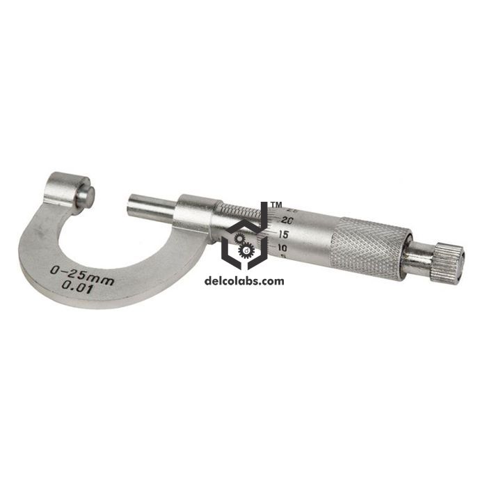 Semi-circular nickel-plated brass body, with ratchet top arrangement and friction stop. Precision machined threaded stainless steel rod that remains entirely concealed and provides long-life error-free functioning. Provision for zero adjustment. Supplied in a suitable plastic case for convenient storage.  Size 0-25 × 0.01mm