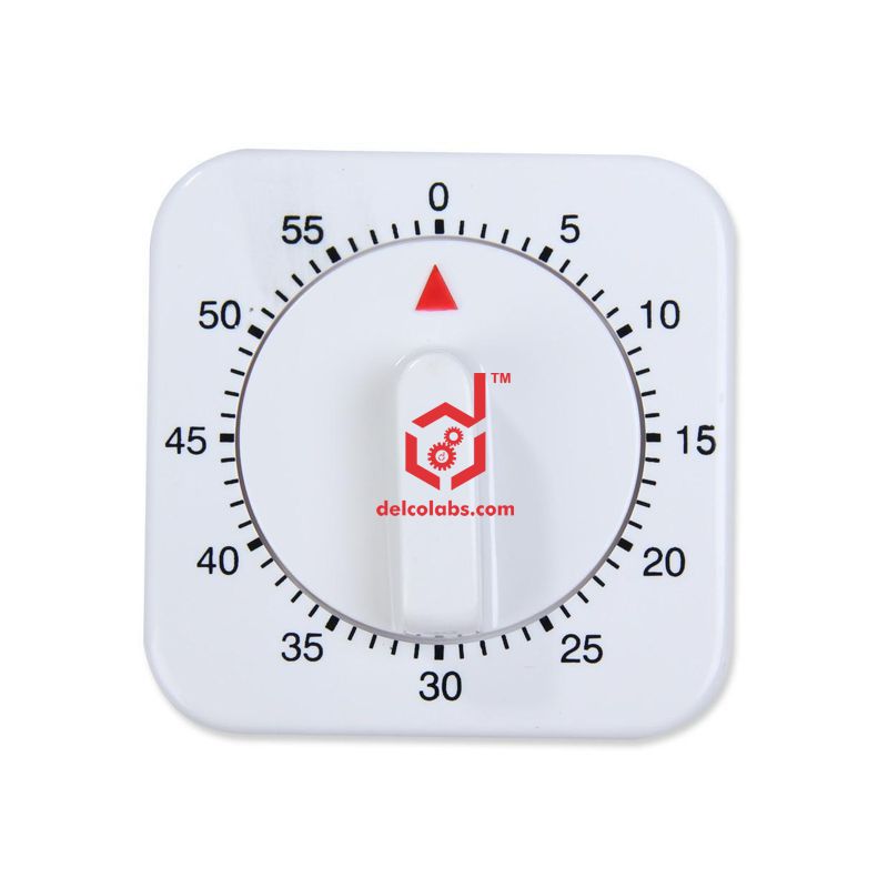 A simple and economical timer that measures one minute intervals up to 1 hour. After setting the desired time interval, a signal indicates the end of the timed period. Knob provided at the top for setting of time interval.