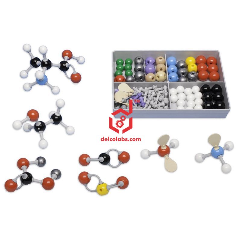 A set for making compact atom models having a wide range of Molecular Geometry structures (VSEPR) Valence Shell Electron Pair Repulsion. Diameter of atom parts ranges from 14 - 23mm.