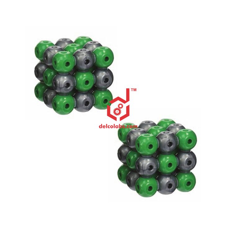 This molecular model demonstrates the structure of Sodium Chloride molecules. The sodium chloride molecular model kit includes the following atom parts:
