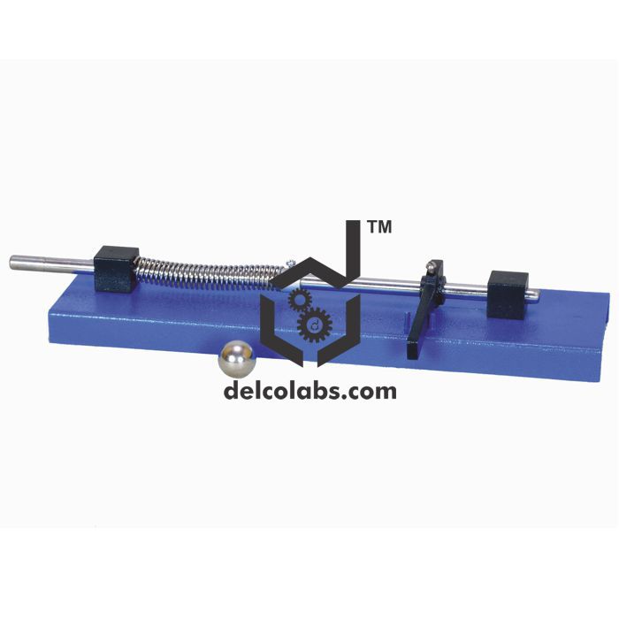 A complete piece of instrument demonstrating the Newton's Second Law of Motion. Comprises a spring loaded steel rod mounted in two brackets on a metal base. Also includes one solid steel sphere and one steel sphere with a hole to slide it into the rod. Complete with a rod mounted on the base for fixing the apparatus on a suitable retort stand. Spring compressed by the handle which can be locked into two different positions corresponding to two potential energy levels. Once spring is compressed, the sphere with the hole slides onto one end of the rod, while other is placed in a small recess on the opposite side of the base. On releasing the handle, the potential energy of the compressed spring imparts horizontal velocity to the solid sphere while the other sphere simply falls vertically. Falling of both the spheres on the ground implies that vertical and horizontal velocities are independent.