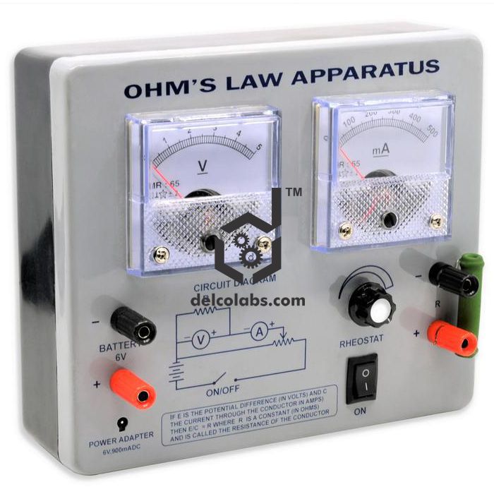 For demonstration of Ohm's law, according to which constant (R). When connected to an external battery through a pair of color coded terminals with a suitable resistance connected across another pair of terminals, the voltmeter and milliammeter readings are available at the press of the key. Current flowing through the circuit can be controlled through a rheostat knob. With milliammeter 0- 500mA DC, voltmeter 0-10V DC, rheostat knob, push key, and 4mm socket terminals mounted on top of sheet metal enclosure having scratch resistant epoxy paint coating. Circuit diagram indicating all components printed on top of the enclosure. External battery and resistances not supplied, available optionally.
