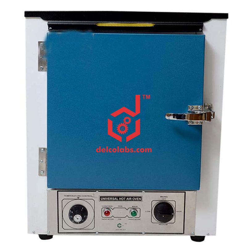 For heating up to 250°C. Inside chamber made of thick aluminium or stainless steel sheet. Outside made of mild steel, the gap between the walls being filled with glass wool. Heating elements are placed in ribs at the bottom and sides of chamber for uniform heating. Thermostatic control is provided which gives a temperature fluctuation of not more than ±1 °C read by an L-shape thermometer. The insulated door closes firmly against heat resistant gasket and is provided with a handle with spring latch. Front panel has ON / OFF switch, 2 neon indicators and dial for temperature setting. Unit provided with 1.5 m of 3-core cable. Works on 220-240 VAC.
