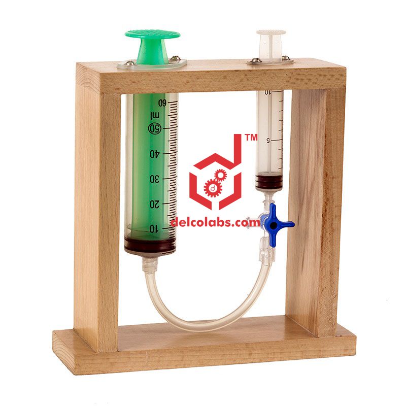 To demonstrate the principal used inside the power steering, shock absorbers, hydraulic jack etc. Two syringes fitted on a wooden stand and connected with a flexible tube. On applying the force to one syringe piston 10mL to make the liquid rise in the other 50mL syringe to demonstrate the Pascal’s Law.