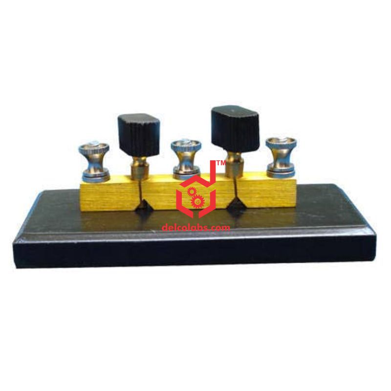 Economical, comprising metal blocks fitted with 4mm screws with terminals and mounted on a moulded plastic base, along with accurately tapered metal plugs with a fluted plastic top to fit in to the hole between the blocks, thus providing a negligible contact resistance.