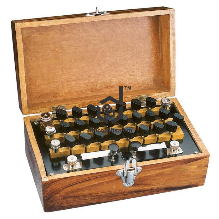 Plug type, in polished teak wood box with hinged lid and black bakelite panel lined in white colour to show circuit connections. Coils of resistance wire, double silk covered, are wound non-inductively and have a negligible temperature co-efficient. Two spring keys having special contact for battery and galvanometer fitted. Accuracy of coils 100 to 500 Ohms ± 0.05% and of the resistance coils ± 0.1%