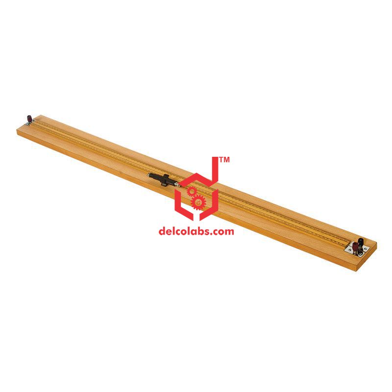 Useful as a potential divider for various electrical experiments such as in null point detection, works on the principle of variation of resistance of a conductor with length. Comprising a 24SWG bare constantan wire stretched along a meter rule, sub-divided in centimeters and millimeters and clamped to stout metal end plates. The clamping system is designed to make good electrical contact with the wire at the exact ends of the scale thus leaving virtually no margin for 'end errors'. The terminating strips are provided with heavy-duty 4mm socket terminals and the complete assembly is mounted on a long baseboard. Supplied with jockey.