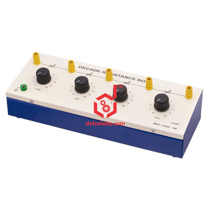 Comprises circular dials mounted underneath a metal cover plate, inside sturdy metal case. Each dial has 10 resistances, with a knob at the top which rotates with positive click stop to select the desired value as indicated alongside index mark on the knob. Provided with a pair of 4mm sockets for connecting the resistances across a circuit and a socket for earthing. Multiple dials are connected in series to add to the total resistances of each dial. Accuracy ±1%.