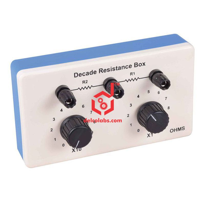 Comprises circular dials mounted underneath a metal cover plate, inside sturdy metal case. Each dial has 10 resistances, with a knob at the top which rotates with positive click stop to select the desired value as indicated alongside index mark on the knob. Provided with a pair of 4mm sockets for connecting the resistances across a circuit and a socket for earthing. Multiple dials are connected in series to add to the total resistances of each dial. Accuracy ±1%.