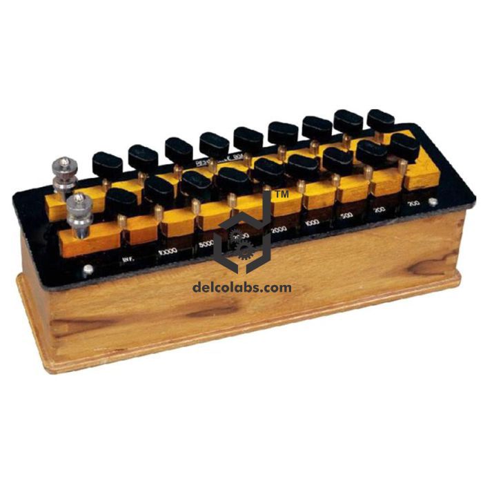 For accurate work. In well-polished wooden box with bakelite panel figured in white. Split brass contact blocks hold precision cut, interchangeable brass plugs having moulded black bakelite fluted tops. Coils of maganin wire, non-inductively wound, double silk covered; with resistances precisely adjusted and are mounted underneath the panel with double nut arrangement. Accuracy ±0.1%.