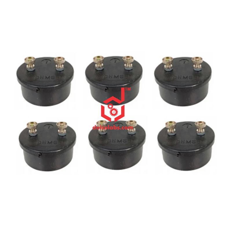 A range of resistance units on a high stability metal film element. Improved and less expensive resistance coil. Mounted in moulded plastic round case. A pair of metal terminals at the top provides its connection in the circuit. Value clearly marked on each coil.
