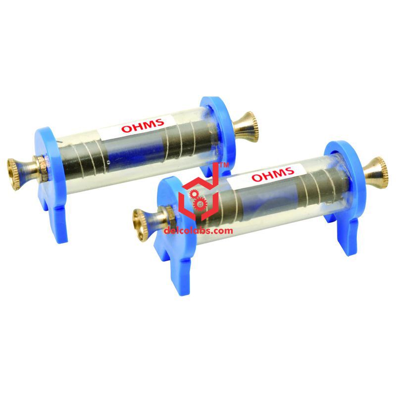 Non-inductively wound with double silk covered constantan coils on plastic shaft enclosed in a transparent plastic tube with a connection terminal at each end. Values clearly marked on each coil. Accuracy ±0.2 %, Rated 1W.