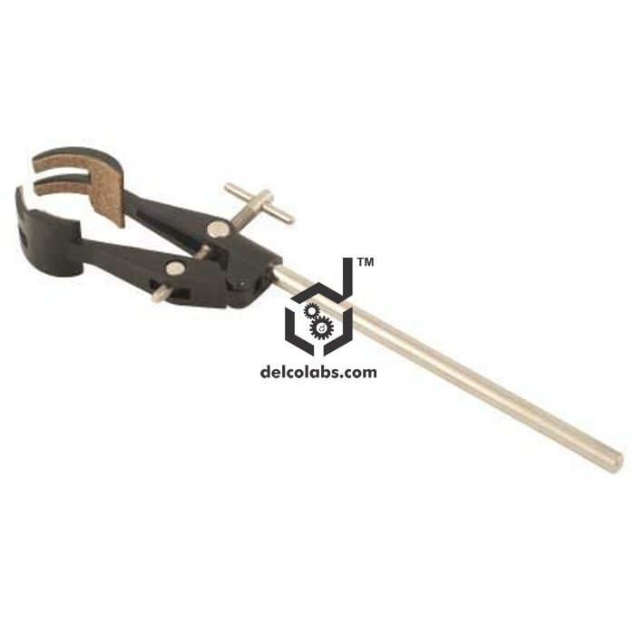 Clamping jaws of Die-cast alloy metal, having four cork lined prongs to take articles from 2-90mm diameter. The design of the jaw ensures a firm grip at all angles of opening. Plated steel thumb screw for tightening the clamp jaws. Fitted with 15cm long plated MS rod for mounting on suitable bosshead.