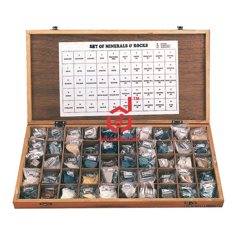 Set of 50 specimens, packed in transparent plastic envelops and contained in a partitioned wooden showcase with lid. Specimens may be taken out for close physical examination. A quality collection of various rocks and mineral, nicely packed. Each specimen properly labeled and numbered.