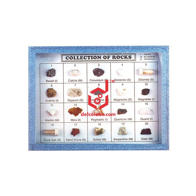 Set of 20 specimens, in a wooden tray with glass front, properly labeled. A comprehensive collection of a range of igneous, metamorphic and sedimentary rocks. Each specimen properly named and numbered.