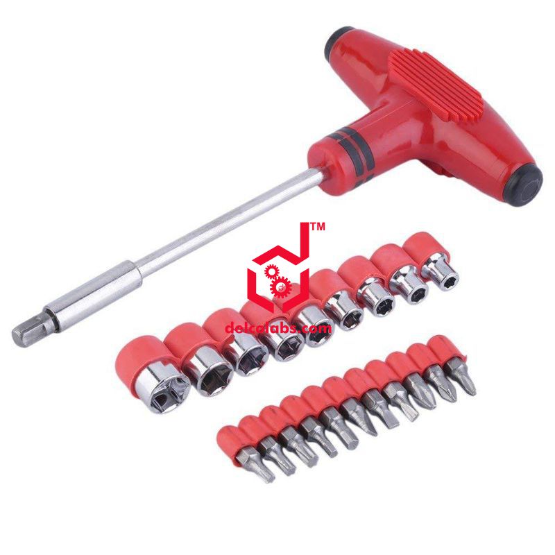 Specially designed, T-shaped, shatterproof, plastic handle with reversible double ended blade in chrome-vanadium steel. Point sizes 1 and 2. Overall length assembled 165mm approx. Comes with a set of assorted screw driver as well as spanner bits in different sizes and an adapter bit.
