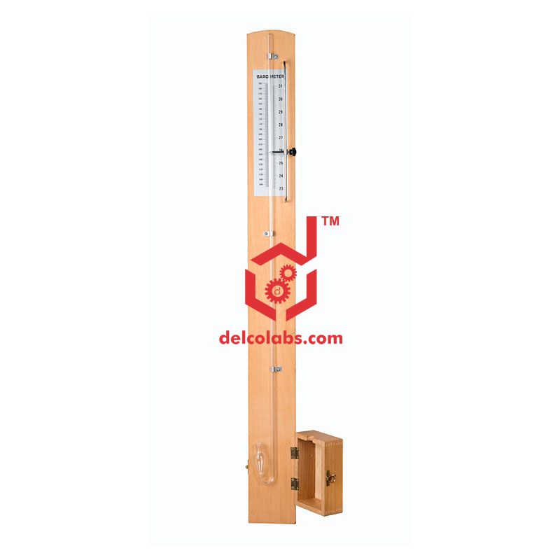 A low cost, simple barometer yet having sufficient accuracy. The whole column of mercury is clearly visible in the glass tube. Barometer scale is graduated in both English and Metric systems. Vertical sliding zero point adjustment is carried by a screw clamp attached to the glass tube. Complete apparatus mounted on a polished wooden board. Supplied without mercury.