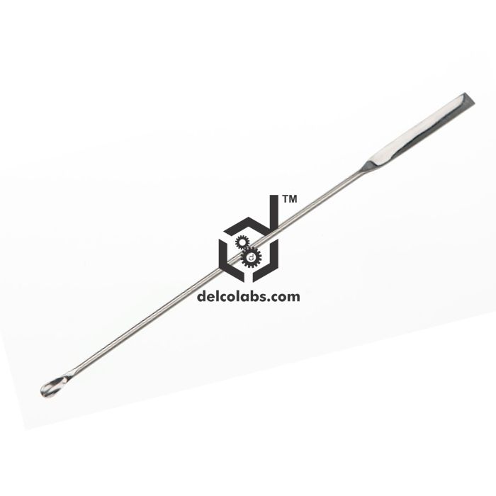 Stainless steel spatula with small spoon shape at one end and other end flat with central portion circular wire shaped.