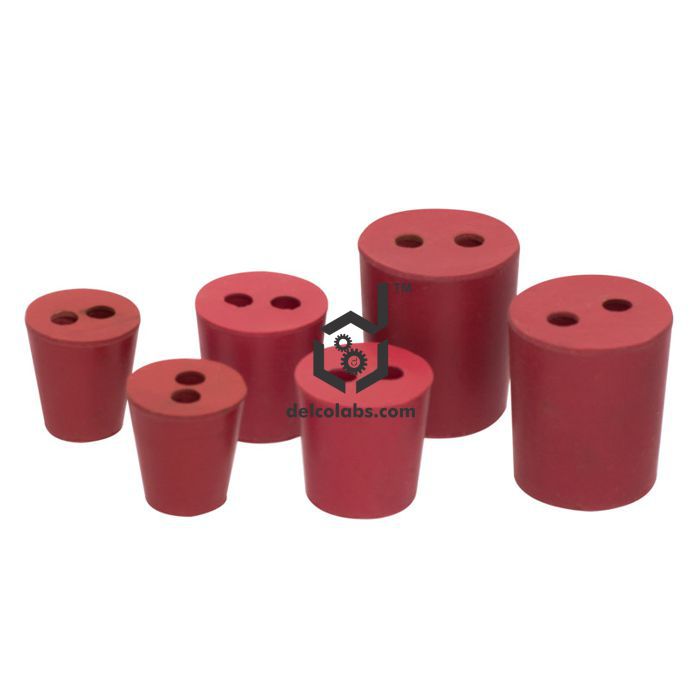 2 holes rubber stoppers; soft, superior quality rubber resistant to acid, alkali and ammonia. Number of cork indicated on the face. Packing size for the stoppers available as per customer's choice.